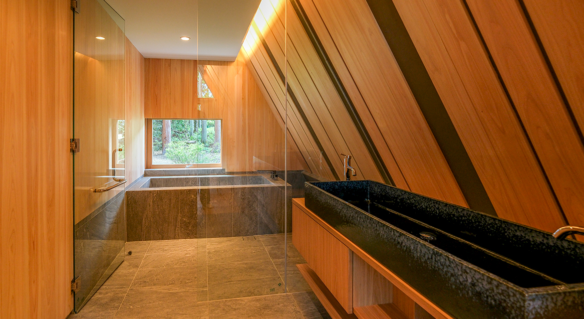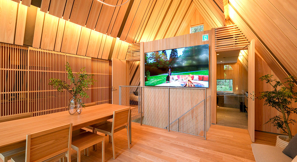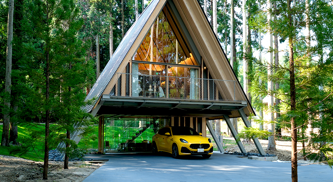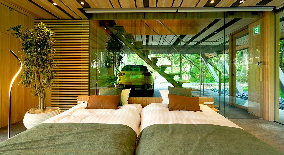 圧倒的な存在感を魅せる斬新なデザイン。森の絶景や自慢の愛車を眺めながら寛げるガラス張りのベッドルーム。建築家隈研吾氏のセンスが光る独創的な空間で、大自然に抱かれる至福のオフタイムを。
