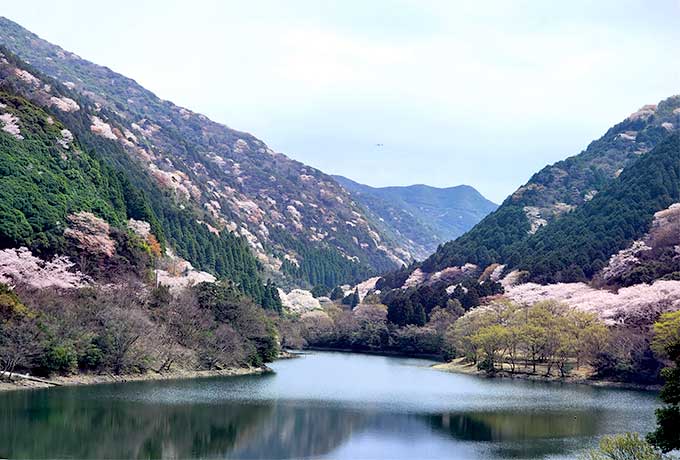 淡路島の最高峰・諭鶴羽山(ゆづるはさん/標高608m)の麓に広がる「諭鶴羽ダム」。ダム湖の外周約2kmの沿道には、約800本のソメイヨシノやヤマザクラが植えられ、春には山の緑と桜のピンクが織りなす絶景が広がります。