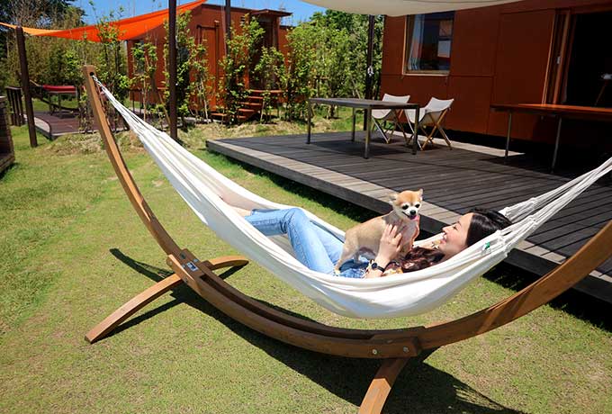 GFC淡路島グランデシアでは、建築家・隈研吾氏とアウトドアブランド「スノーピーク」が共同開発した「住箱(ジュウバコ)」でのグランピング体験が可能です。住居スペースとバス・トイレの住箱を2台セットにした贅沢な設計で、各住箱の前には専用のウッドテラスが設けられ、テラスBBQやハンモックでのお昼寝を楽しめます。