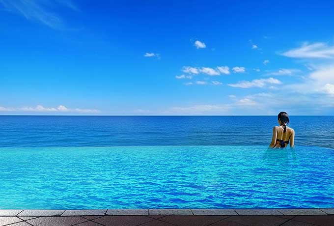 GFC越前パラデシアの一番の魅力は、水面と海がつながって見える「インフィニティプール」。雄大な日本海を目の前にしながら泳ぐ体験は、まさに非日常のリゾート感を演出してくれます。プールサイドには寛げるソファセットも配置されているので、子どもたちが泳いでいる間に、親はゆったりと読書やお昼寝を楽しむことができます。