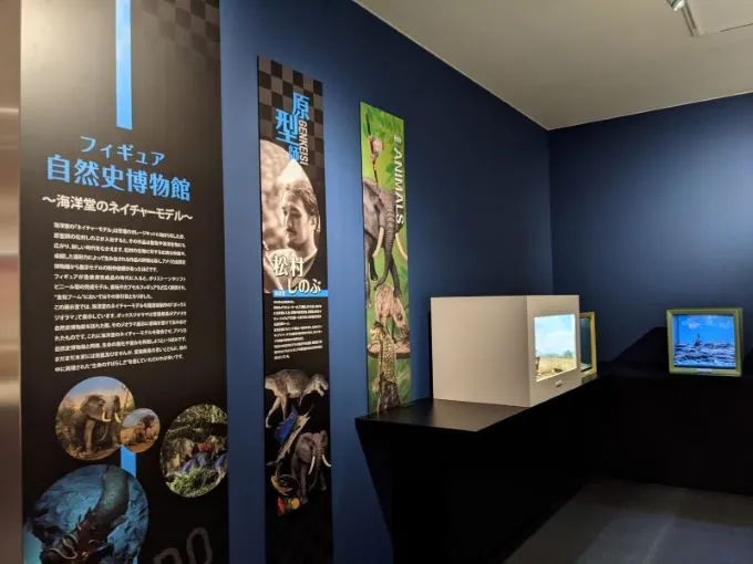 企画展示室では「日本の生き物図鑑」「海洋堂古生物博物館」「ユーモア&ウィット」「エヴァンゲリオン新劇場版」「アニメ・ゲーム」「特撮・洋画」などのコーナーに分けて展示しています。この後は特に印象的だったボックスジオラマを紹介していきますね。