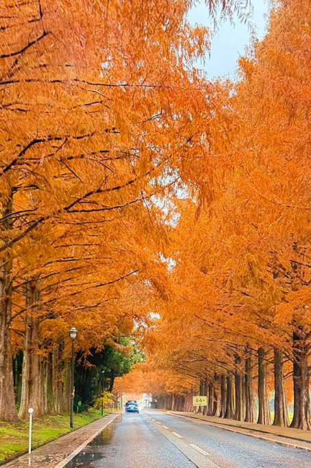 ちょうど紅葉がピークを迎えており、燃えるように色づく約2.4kmの並木道は、車窓から眺めるだけで絵画のよう。週末は渋滞になるほどの人気スポットですが、今回は雨模様の平日だったためスムーズに走ることができ、なんと2往復も堪能できました。緑の季節、赤の季節、そして冬の白い並木道。「3つの季節をいつか全部制覇したい・・」そんな気持ちにさせてくれます。