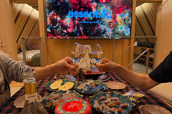 お菓子を持ち寄り、スパークリングワインを開けて、女子会スタート。湖畔の静けさに包まれながら、昔話から美容トークまで尽きることなく盛り上がり、「女子旅って最高!」と心から実感した夜でした。