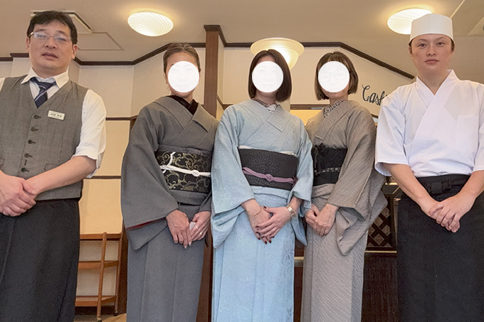 マネージャーと料理長と一緒に記念撮影。私たち、仲居さんみたいになっちゃいましたね笑