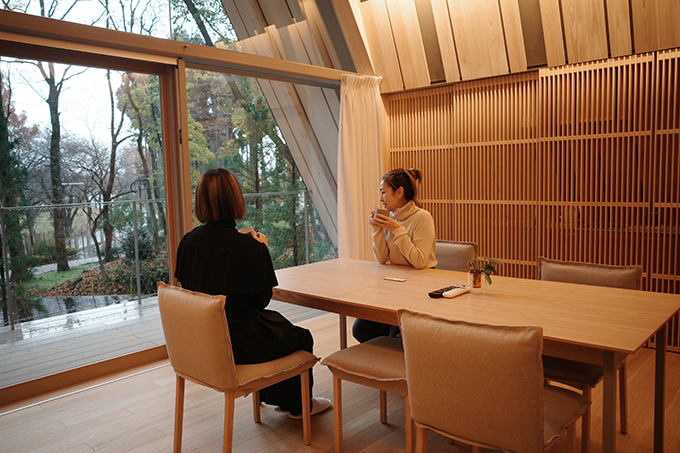 10月に誕生したばかりの、隈研吾氏デザインによる新ヴィラ「アトリエ」。“自然と寄り添う建築”を体現するように、琵琶湖の風、木の素材感、柔らかな光が調和し、まるで森の中のアトリエに招かれたかのような心地よさ。女子3人の声が思わず弾む、特別な空間です。