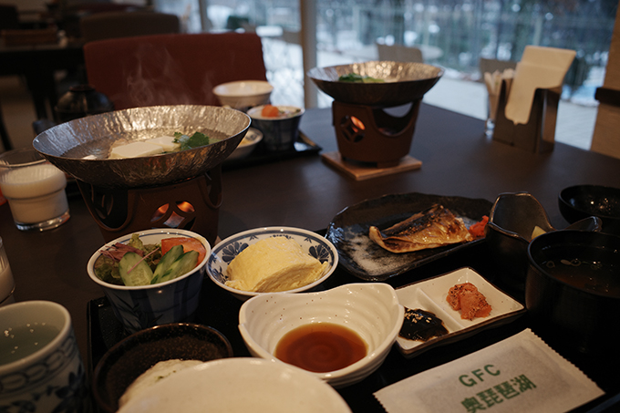 滋賀の恵みをシンプルかつ丁寧に味わえる和朝食。炊きたてのご飯、出来立てのだし巻き卵、寒い朝に嬉しい湯豆腐が体をじんわり温めてくれます。1日の始まりが体にすっと染みわたる、優しい朝ごはんでした。