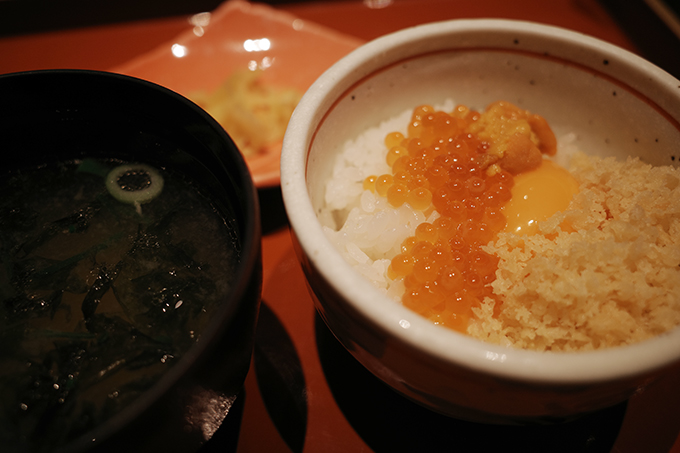 そして嬉しいのが、2杯目としてミニ“うにいくら卵かけ丼”が付いてくること!卓上の自家製天かすとトロたくをトッピングすれば、