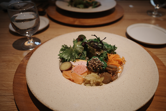 有機野菜を中心にビワマスのマリネ、自家製ハム、ゴボウのトマト煮、サツマイモの甘露煮、人参のシリシリなど季節感じるプレート