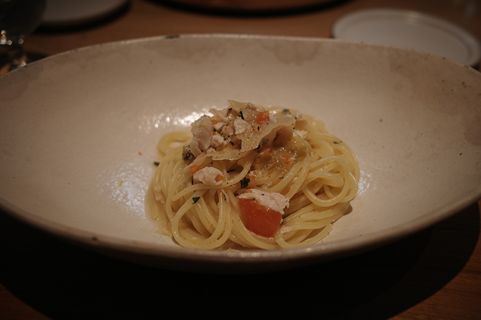 蒸し鶏とキャベツの塩レモンオイルソースパスタ。もちもちでソースが良く絡みペロっと平らげました。