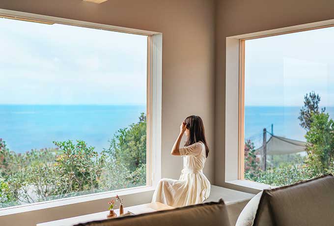 どこまでも青く広がる日本海の雄大な眺めが魅力の越前海岸。グラスウォールに囲まれた「スマートヴィラ」や世界各国の建築様式を取り入れた戸建てヴィラ、ログハウスがお迎えいたします。