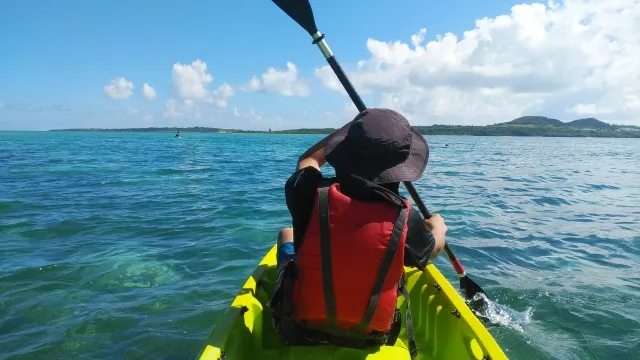 シーカヤックとはカヌーの仲間で、両端に水かきがついたパドルを自分で漕いで海の上を前進・散策するアウトドアアクティビティ。夏以外でも海を感じることができるマリンスポーツです。