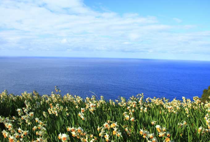 灘黒岩水仙郷(車で約45分)は、日本三大水仙群生地の一つとして知られ、500万本ともいわれる野生の水仙が海を背景に咲き誇る壮大な景色を堪能できます。